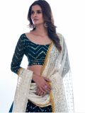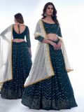 Exude indian elegance as you wear this peacock green color designer lehenga in georgette. Enhanced with sequins and thread embroidered work. Teamed with a matching green color embroidered choli and white dupatta, both made in georgette. Note: The accessories featured are purely for fashion purposes. Due to photography reasons, some color variations may occur. The semi-stitched choli and lehenga waist may be customized up to 42 inches.