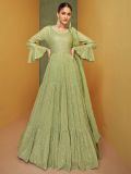 Twirl in style as you wear this light green color anarkali suit in georgette. Furnished using thread and sequins embroidery all over. Teamed up with a matching georgette dupatta and a matching bottom in shantoon. Note: Accessories shown are for styling purpose only. Slight color variation may occur due to photographic reasons. The semi-stitched kameez can be customised upto 42 inches.