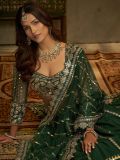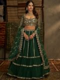 Give a glamorous glance wearing this deep green color designer lehenga in net. Augmented with sequins and thread, zari embroidered work. Available with a matching green color embroidered choli and green embellished dupatta, both made in net. Note: The accessories featured are purely for fashion purposes. Due to photography reasons, some color variations may occur. The semi-stitched choli and lehenga waist may be customized up to 42 inches.