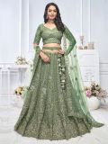 Embrace your ethnic self as you wear this green color designer lehenga in soft net. Designed with sequins, stone and floral thread embellished with heavy zari embroidery all over. Paired with a matching green color embroidered choli and a green color dupatta, both made in soft net. Note: The accessories featured are purely for fashion purposes. Due to photography reasons, some color variations may occur. The semi-stitched choli and lehenga waist may be customized up to 42 inches.