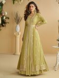 Look no less than a dream wearing this green color ruffle style gown designed in heavy chinon silk. Enhanced with sequins work embellishment and heavy floral zari embroidery all over. Available with matching green color full slveed embroidered shrug made in heavy chinon silk. Note: Some color variations may occur owing to photography causes. Up to 1 inch of measurement fluctuation is possible.