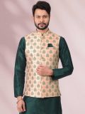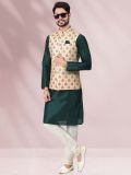 Presenting this green color kurta made in art silk. Comes with a cream color printed nehru jacket made in banarasi silk and white color churidaar in art silk. Note: Some color variations may occur owing to photography causes. Up to 1 inch of measurement fluctuation is possible.