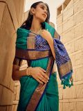 Show your feminine side to the world wearing this rama green color saree in silk. Crafted using bandhani with patola print enhanced by distinctive woven border and tasseled pallu. Paired with a matching green color printed blouse in silk. Note: The accessories featured are purely for fashion purposes. Due to photography reasons, some color variations may occur. The un-stitched blouse may be customized up to 42 inches.