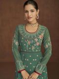 Bring out your hidden charm wearing this viridian green color anarkali kameez in georgette. Augmented using thread work embroidery with stones all over. Assembled with a matching georgette dupatta and a matching palazzo in shantoon. Note: Accessories shown are for styling purpose only. Slight color variation may occur due to photographic reasons. The semi-stitched kameez can be customised upto 42 inches.