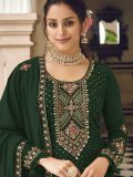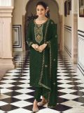 Elevate your festive sporting this dark green color straight cut kameez in georgette. Furnished using sequins, stones and thread embroidery all over. Teamed with a matching georgette dupatta and a matching shantoon pants. Note: Accessories shown are for styling purpose only. Slight color variation may occur due to photographic reasons. The semi-stitched kameez can be customised upto 42 inches.