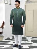 Be the talk of the party wearing this green shaded full sleeved kurta made in jacquard. Decorate with thread work embroidery details. Paired with white color trousers in silk. Note: Some color variations may occur owing to photography causes. Up to 1 inch of measurement fluctuation is possible.