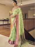 Look fairly festive as you wear this green color saree crafted in tusssar silk. Crafted using zari woven patterns, showcasing distinstive borders and pallu with threaded tassels. Assembled with a matching green color blouse in tussar silk. Note: The accessories featured are purely for fashion purposes. Due to photography reasons, some color variations may occur. The un-stitched blouse may be customized up to 42 inches.