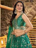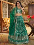 Bedazzle everyone around you wearing this rama green color bridesmaid lehenga in dola silk. Elevated with sequins and heavy zari embroidered work all over. Paired with a matching green color embroidered choli in dola silk and a green color dupatta, made in organza. Note: The accessories featured are purely for fashion purposes. Due to photography reasons, some color variations may occur. The semi-stitched choli and lehenga waist may be customized up to 42 inches.