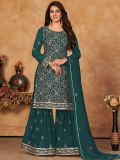 Grab all the compliments adorning this ocean green color kameez in georgette. Augmented using zari, sequins and thread work embroidery all over. Available with a matching georgette dupatta and a matching sharara in shantoon. Note: Accessories shown are for styling purpose only. Slight color variation may occur due to photographic reasons. The semi-stitched kameez can be customised upto 42 inches.
