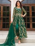 Displaying this emerald green color slitted anarkali kameez in net. Decorated using zari and dori embroidery all over. Paired with a matching net dupatta and an embroidered pant in satin. Note: Accessories shown are for styling purpose only. Slight color variation may occur due to photographic reasons. The semi-stitched kameez can be customised upto 42 inches.