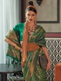 Slay with your classy taste as you wear this royal green color saree crafted in silk. Designed using zari woven patterns, showcasing tasseled pallu. Comes with a matching green color blouse in silk. Note: The accessories featured are purely for fashion purposes. Due to photography reasons, some color variations may occur. The un-stitched blouse may be customized up to 42 inches.