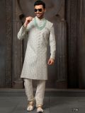 Presenting this lush grey color sherwani made in art silk. Augmented using Thread Work embroidery with sequins work. As shown it comes with an white color churidaar in dupion silk. Note: Some color variations may occur owing to photography causes. Up to 1 inch of measurement fluctuation is possible.