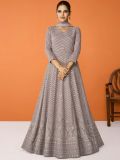 Displaying this elephant grey color anarkali kameez in georgette. Designed using sequins and thread work embroidery all over. Assembled with a matching georgette dupatta and a matching bottom in shantoon. Note: Accessories shown are for styling purpose only. Slight color variation may occur due to photographic reasons. The semi-stitched kameez can be customised upto 42 inches.