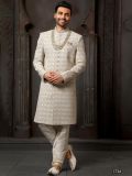 Take your ethnic closet a notch higher adorning this grey color sherwani made in art silk. Crafted using thread, sequins embroidery with stone work. As shown it comes with an off-white color churidaar in dupion silk. Note: Some color variations may occur owing to photography causes. Up to 1 inch of measurement fluctuation is possible.
