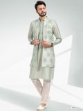 Look dapper adorning this grey color men's kurta made in art silk. Comes with a jacket enriched with thread embroidery with sequins embellishment work. Paired with a matching white color churidaar in art silk. Note: Some color variations may occur owing to photography causes. Up to 1 inch of measurement fluctuation is possible.