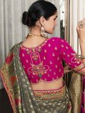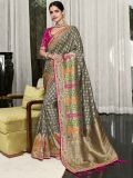 Exude regal vibes sporting this grey color saree crafted in silk. Augmented using zari woven patterns, thread and sequins embroidery showcasing distinstive borders. Paired with a contrast matching pink color blouse in silk. Note: The accessories featured are purely for fashion purposes. Due to photography reasons, some color variations may occur. The un-stitched blouse may be customized up to 42 inches.