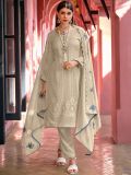Make a stylish appearance with this soft grey color straight cut kameez in georgette. Furnished using sequins and thread work embroidery all over. Available with an embroidered georgette dupatta and a matching pants in shantoon. Note: Accessories shown are for styling purpose only. Slight color variation may occur due to photographic reasons. The semi-stitched kameez can be customised upto 42 inches.