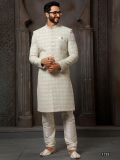 Steal the show adorning this grey color sherwani made in art silk. Furnished using thread, sequins embroidery with stone work. As shown it comes with an off-white color churidaar in dupion silk. Note: Some color variations may occur owing to photography causes. Up to 1 inch of measurement fluctuation is possible.