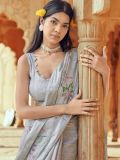 Look elegant wearing this grey color saree crafted in linen. Elevated using floral printed patterns. Comes with a matching grey color blouse in linen. Note: The accessories featured are purely for fashion purposes. Due to photography reasons, some color variations may occur. The un-stitched blouse may be customized up to 42 inches.