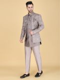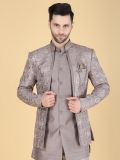 Adorning yourself in the poetry wearing this grey color front open jodhpuri suit set designed in silk. Enhanced using sequins embroidered and floral thread embellishment all over. Topped with a matching grey color embroidered jacket. Comes with a grey color pant in silk. Note: Some color variations may occur owing to photography causes. Up to 1 inch of measurement fluctuation is possible.