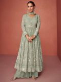 Look no less than a dream adorning this elephant grey color anarkali kameez in georgette. Enhanced using thread and mirror like embroidery all over. Paired with a matching georgette dupatta and a matching bottom in georgette. Note: Accessories shown are for styling purpose only. Slight color variation may occur due to photographic reasons. The semi-stitched kameez can be customised upto 42 inches.