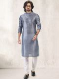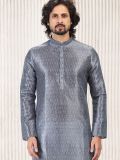 Get set to look regal adorning this grey color kurta made in banarasi silk. Designed with a printed details all over, with potli buttons along the placket. Comes with a white color churidar pants in art silk. Note: Some color variations may occur owing to photography causes. Up to 1 inch of measurement fluctuation is possible.