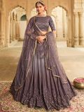 Get set to spread some regal vibes wearing this grey hued shaded designer lehenga in silk. Crafted with intricate sequins and thread embroidered work. Paired with a matching grey color choli in silk and a grey bordered net dupatta, both embellished in similar work. Please keep in mind that the accessories featured are purely for fashion purposes. Due to photography reasons, some color variations may occur. The semi-stitched choli and lehenga waist may be customized up to 42 inches.