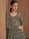 Stand out amongst the rest wearing this sardine grey color anarkali kameez in georgette. Designed using thread work embroidery with stones all over. Assembled with a matching georgette dupatta and a matching palazzo in shantoon. Note: Accessories shown are for styling purpose only. Slight color variation may occur due to photographic reasons. The semi-stitched kameez can be customised upto 42 inches.
