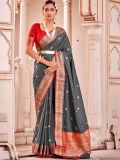 Walk with indian regality adorning this grey color saree crafted in banarasi silk. Enhanced using zari woven jacquard patterns, showcasing distinstive borders and pallu. Paired with a contrast matching red color blouse in banarasi silk. Note: The accessories featured are purely for fashion purposes. Due to photography reasons, some color variations may occur. The un-stitched blouse may be customized up to 42 inches.