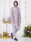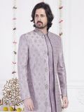 Creating manifestation of your journey to forever adorning this heather purple color jacket style indowestern made in art silk. Enhanced using sequins work embroidery with heavy floral thread embellishment all over. Paired with a matching purple color embroidered jacket and a purple color pant made in art silk. Note: Some color variations may occur owing to photography causes. Up to 1 inch of measurement fluctuation is possible.