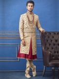 Get a classy rich demeneaur carrying this Golden Colour Silk Fabric Men's Designer Sherwani.