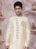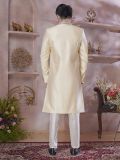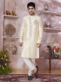 Creating a striking visual effect with this ivory cream color sherwani made in malai banarasi silk. Crafted using sequins and floral thread work with floral zari weaving all over. Paired with a off white color pyjama made in art silk. Note: Some color variations may occur owing to photography causes. Up to 1 inch of measurement fluctuation is possible.
