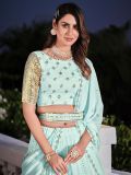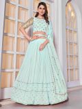 Spread your soothing aura everywhere wearing this light blue color lehenga in georgette. Designed with sequins and thread embroidered work. Available with a matching blue color embroidered choli, an embroidered belt and blue dupatta, both made in georgette. Note: The accessories featured are purely for fashion purposes. Due to photography reasons, some color variations may occur. The semi-stitched choli and lehenga waist may be customized up to 42 inches.