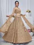 Give a glamorous glance wearing this light brown color designer lehenga in soft net. Furnished with sequins, stone and floral thread embellished with heavy zari embroidery all over. Paired with a matching brown color embroidered choli and a brown color dupatta, both made in soft net. Note: The accessories featured are purely for fashion purposes. Due to photography reasons, some color variations may occur. The semi-stitched choli and lehenga waist may be customized up to 42 inches.