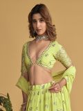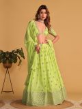 Overwhelm the audience as you wear this light green color lehenga in georgette. Augmented with zari with thread work embroidery all over. Paired with a matching green color embroidered choli in georgette and green color dupatta, made in georgette. Note: The accessories featured are purely for fashion purposes. Due to photography reasons, some color variations may occur. The semi-stitched choli and lehenga waist may be customized up to 42 inches.