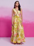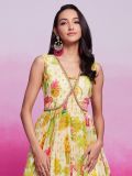 Get the praiseworthy look wearing this light yellow color cut sleeves gown made in organza. Decorated using hand work and stone work with floral printed pattern all over. Note: Some color variations may occur owing to photography causes. Up to 1 inch of measurement fluctuation is possible.