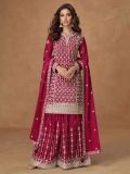 Bedazzle everyone around you wearing this magenta color straight cut full sleeved kameez made in chinon silk. Furnished using sequins and silver zari work embellishment all over. Available with a matching magenta color palazzo style bottom and a magenta color dupatta, both made in chinon silk. Note: Accessories shown are for styling purpose only. Slight color variation may occur due to photographic reasons. The semi-stitched kameez can be customised upto 42 inches.