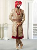 Look dapper in this Golden banarasi silk sherwani decked with Zardozi, zari, resham embroidery, stone work complemented with maroon anarkali kurta to match with the brides dress. Feel dressed like a king with your queen on the special day of your wedding.