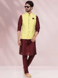 Exhibiting this maroon color kurta made in art silk. Paired with a yellow color printed nehru jacket made in banarasi silk and maroon color churidaar in art silk. Note: Some color variations may occur owing to photography causes. Up to 1 inch of measurement fluctuation is possible.