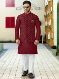 Show your indianness adorning this maroon color kurta made in jacquard. Topped with an embroidered maroon nehru jacket made in jacquard. Available with a white color trouser pants in cotton. Note: Some color variations may occur owing to photography causes. Up to 1 inch of measurement fluctuation is possible.