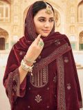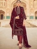 Get all dolled up wearing this maroon color straight cut kameez in velvet. Designed with printed details all over. Comes with matching pashmina pants and printed velvet dupatta. Note: Accessories shown are for styling purpose only. Slight color variation may occur due to photographic reasons. The semi-stitched kameez can be customised upto 42 inches.