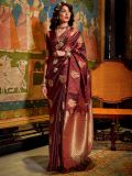 Raise the fashion bars donning in this maroon color festive saree crafted in satin. Designed with zari woven jacquard patterns all over, showcasing distinstive pallu with thread tassels. Comes with a matching maroon color blouse in satin. Please keep in mind that the accessories featured are purely for fashion purposes. Due to photography reasons, some color variations may occur. The un-stitched blouse may be customized up to 42 inches.