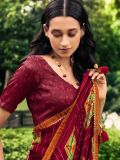 Show your feminine style adorning this maroon color saree crafted in chiffon. Decked with digital floral patterns and foil printed patterns, showcasing distinstive borders. Comes with a matching maroon color printed blouse in chiffon. Note: The accessories featured are purely for fashion purposes. Due to photography reasons, some color variations may occur. The un-stitched blouse may be customized up to 42 inches.