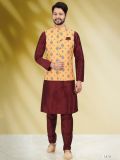 Look elegant as you wear this maroon color kurta made in art silk. Comes with an orange color printed nehru jacket made in banarasi silk and maroon color churidaar in art silk. Note: Some color variations may occur owing to photography causes. Up to 1 inch of measurement fluctuation is possible.