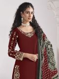 Step into the spotlight as you wear this maroon color straight cut kameez made in roman silk. Decorated using sequins and mirror work embellishment with floral zari embroidery all over over. Paired with a matching maroon color punjabi style bottom in santoon fabric and a maroon color bandhani printed dupatta made in chanderi silk. Note: Accessories shown are for styling purpose only. Slight color variation may occur due to photographic reasons. The semi-stitched kameez can be customised upto 42 inches.