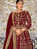 Reveal your sartorial side with this maroon color anarkali kameez in velvet. Curated using zari and thread work, dori embroidery with stones all over. Teamed with a matching net dupatta and a matching bottom in net. Note: Accessories shown are for styling purpose only. Slight color variation may occur due to photographic reasons. The semi-stitched kameez can be customised upto 42 inches.