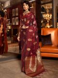 Get set to look regal donning in this maroon color festive saree crafted in satin. Augmented with zari woven jacquard patterns all over, showcasing distinstive pallu with thread tassels. Comes with a matching maroon color blouse in satin. Please keep in mind that the accessories featured are purely for fashion purposes. Due to photography reasons, some color variations may occur. The un-stitched blouse may be customized up to 42 inches.