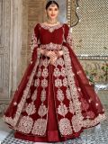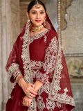 Glam up sweetly with this maroon color slitted anarkali kameez in velvet. Enriched using zari and thread work embroidery with stones all over. Available with a matching net dupatta and a matching bottom in net. Note: Accessories shown are for styling purpose only. Slight color variation may occur due to photographic reasons. The semi-stitched kameez can be customised upto 42 inches.