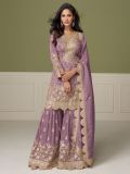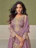Show your feminine side to the world wearing this mauve color full sleeved straight cut kameez made in real simar silk. Augmented using sequins enhanced and floral zari work embroidery with mirror work embellishment all over. Paired with a matching mauve color embroidered sharara style bottom and a mauve color dupatta, both made in simar silk. Note: Accessories shown are for styling purpose only. Slight color variation may occur due to photographic reasons. The semi-stitched kameez can be customised upto 42 inches.