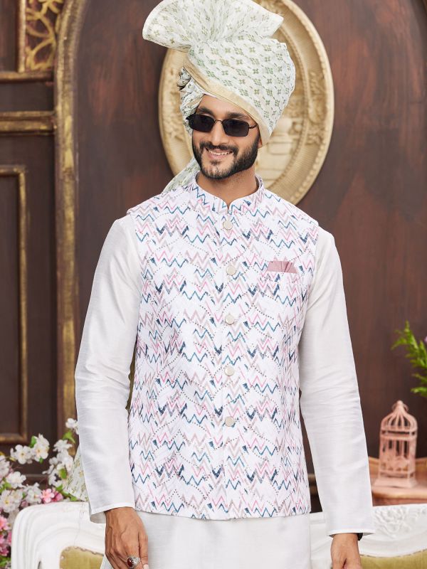 Cream Festive Mens Kurta Set With Embroidered Jacket